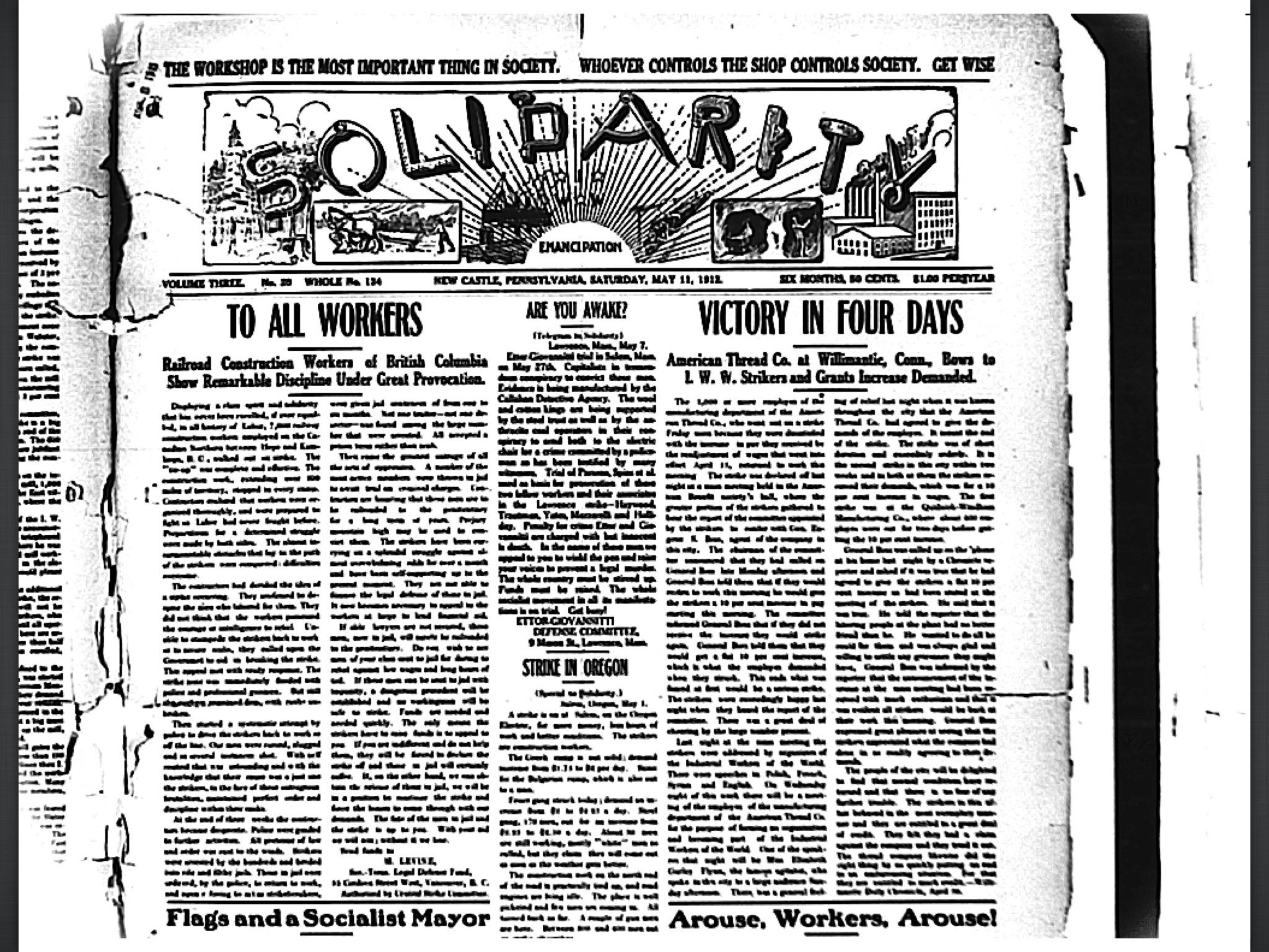 imageThe IWW newspaper Solidarity recorded the “Victory in Four Days” in 1912 at the American Thread Company in Willimantic, CT.  An earlier victory by the Quidnick-Windham Mill provided inspiration to the American Thread workers.  Both workforces– and a number of others– were well aware of the successful fight by Lawrence, MA textile workers, since IWW organizers travelled to the Thread City” on their way to and from Lawrence.