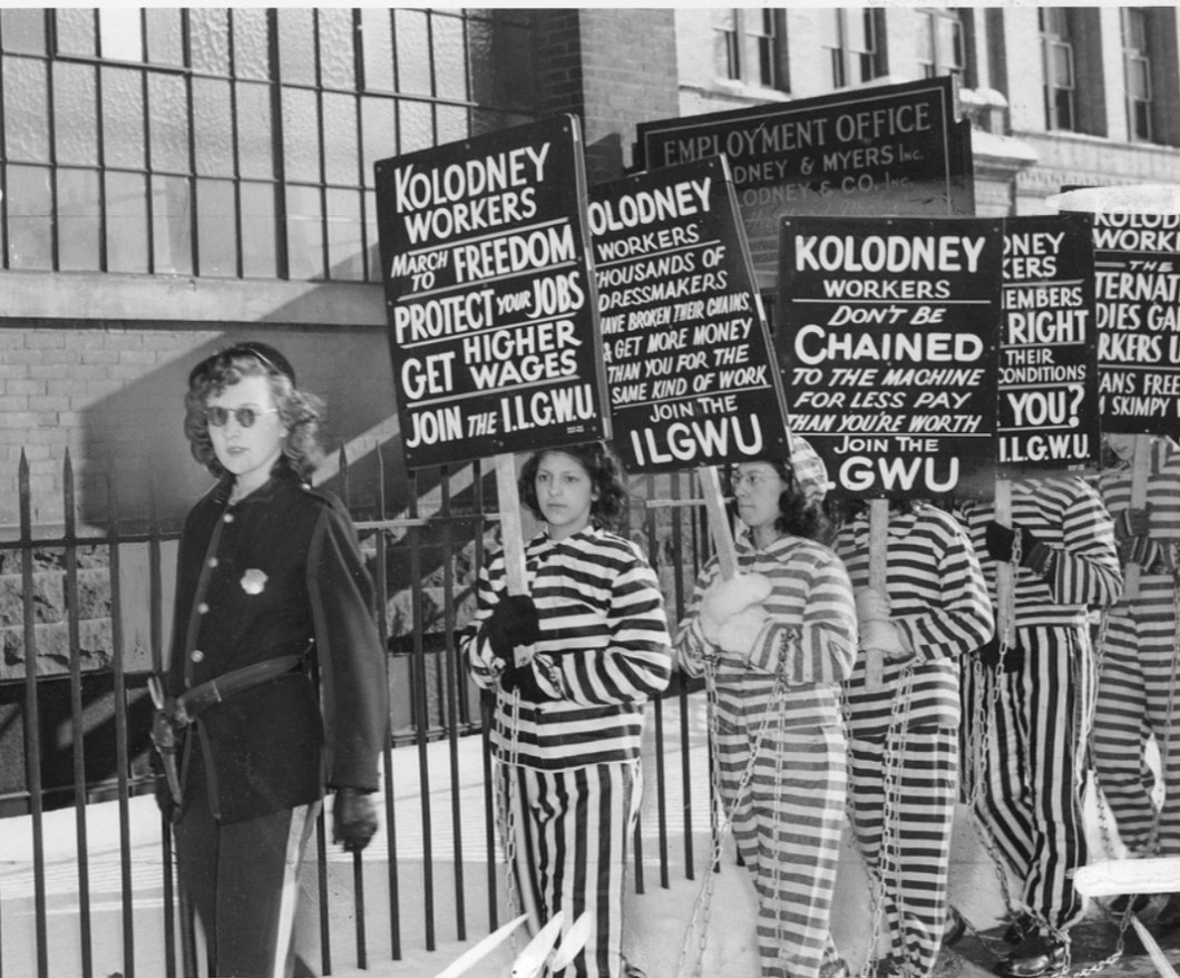 “Don’t be chained to the machine!” Union organizer Feigel Levine (left, dressed as jailer) leads picket line of workers in prison garb. [Kheel Center for Labor-Management Documentation and Archives, Cornell University Library]