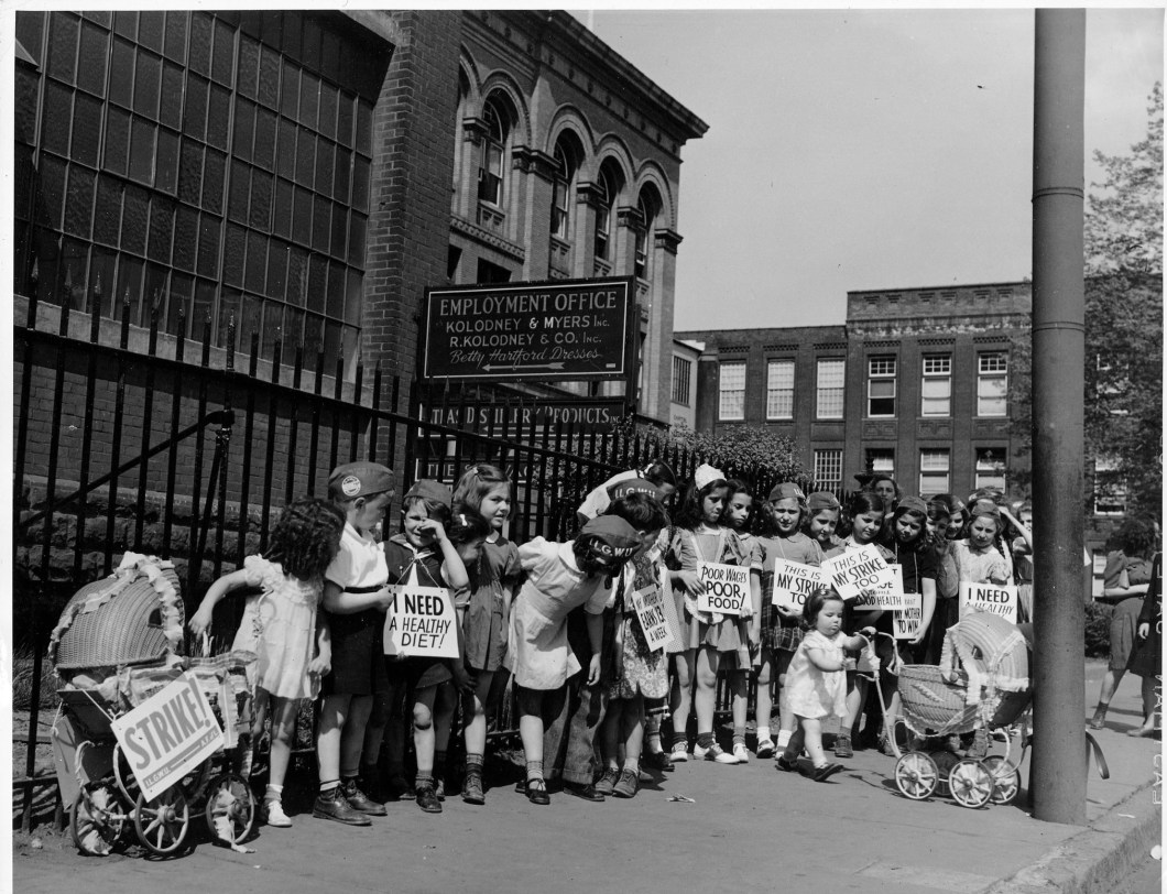 Strikers’ kids on the picket line. [Kheel Center for Labor-Management Documentation and Archives, Cornell University Library]Picketing lasted every work day, so the Union bought new shoes for all strikers. After 5 weeks, weekly strike pay increased from $10 to $20, along with a transportation stipend and a daily two- meal allowance.