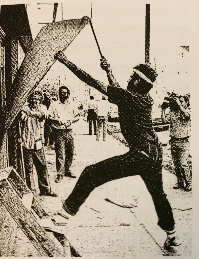 The action has plenty of support throughout the city. Next to the protest site, a second story window opens and out pops Ramón Quiros, the veteran Puerto Rican community and civil rights activist. He is excited and happy to see what is transpiring. After a hearty pledge of support, Quiros flies the Puerto Rican flag from his window.